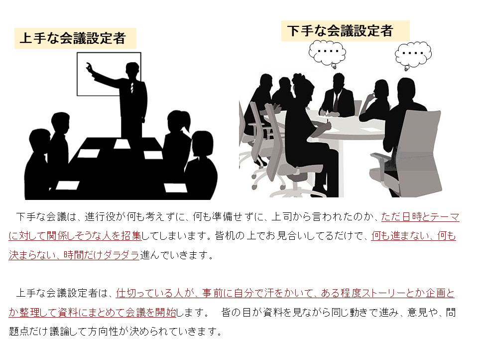 上手な会議設定者は、仕切っている人が、事前に自分で汗をかいて、ある程度ストーリーとか企画とか整理して資料にまとめて会議を開始します。 皆の目が資料を見ながら同じ動きで進み、意見や、問題点だけ議論して方向性が決められていきます。