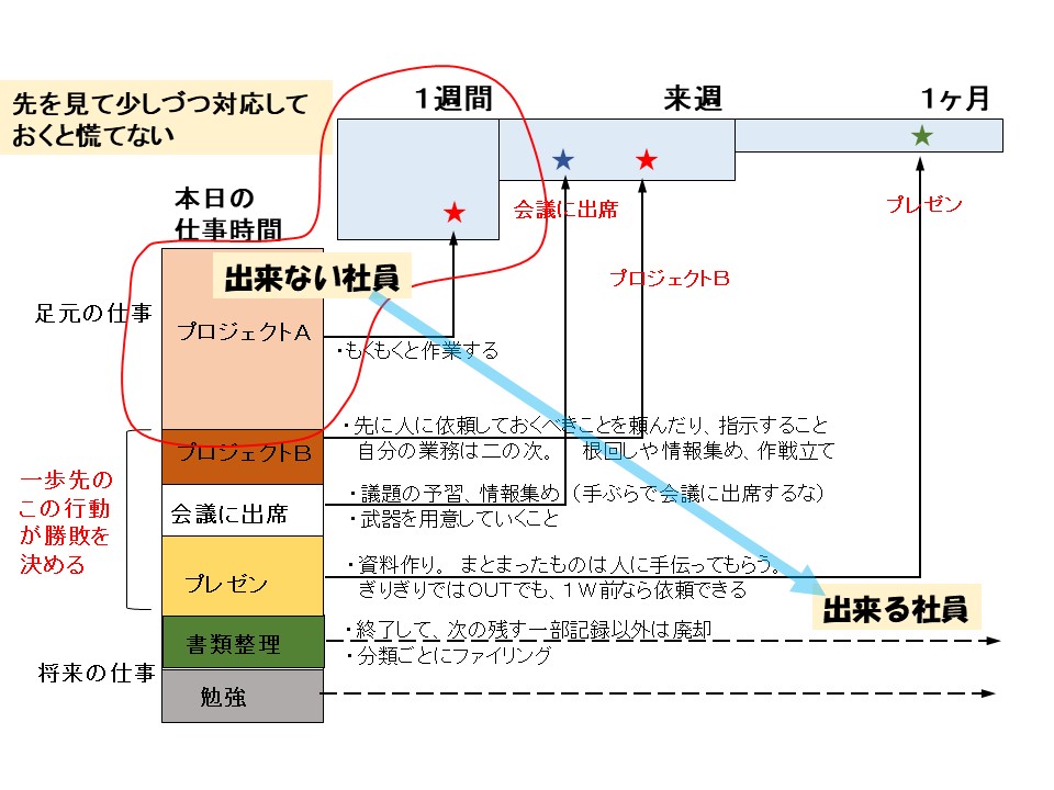 来週に迫った大きな会議体では手ぶらで会議に出席しないように準備をしておきます。議題の情報集めを行って、資料はメモの1枚でも武器を用意していくことです。そして、今月末にあるプレゼンの準備もあります。 プレゼンの資料作りは、ストーリーや構成を自分で考えておき、まとまった資料作成は早めに事務職の方に手伝ってもらうようにして、自分の工数を下げておくことです。