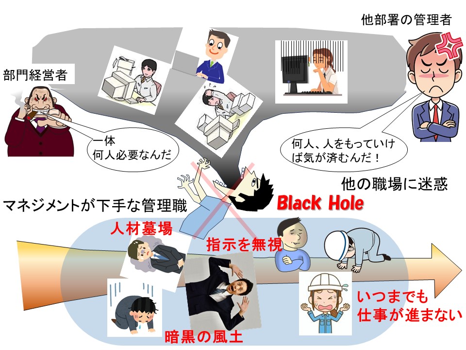 しかしいくら人を投入してもなかなか解決していきません。 一体何人、どこまで投入すれば解決するんだろうか。隣の部署からは2人応援に出したが何の仕事についているのかうまく機能してないように思えます。こういった人を飲み込んでいくノーマネジメントのリーダーを「ブラックホール」と呼びます。