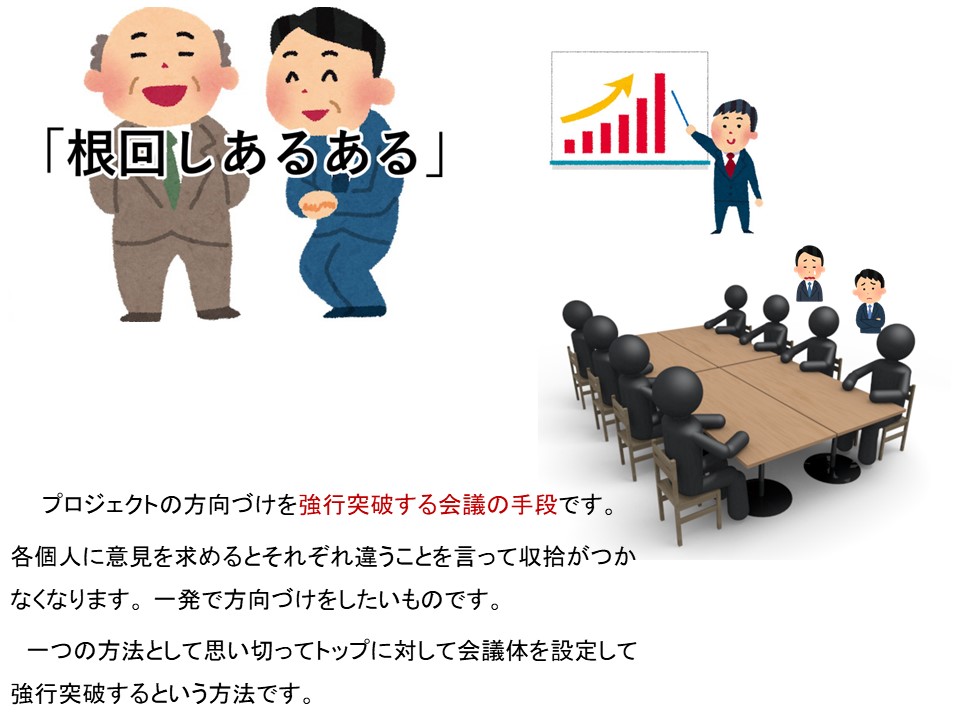 プロジェクトの方向づけを強行突破する会議の手段です。