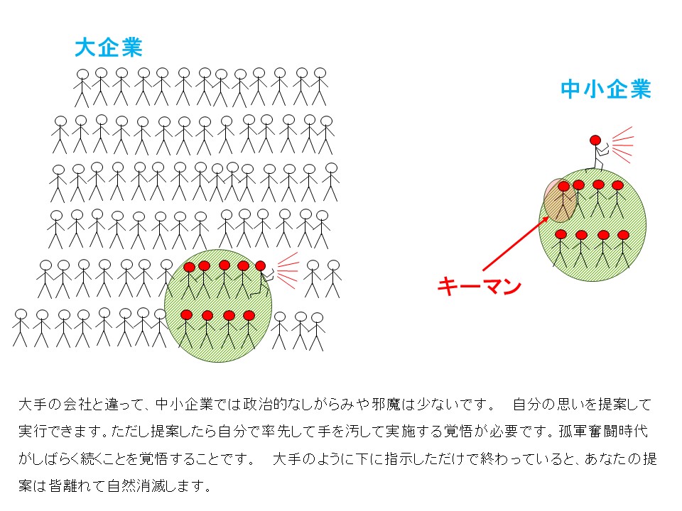 中小企業では、上位の役職の人が、イエスと言って決めたとしても、実態はそのキーマンの人が前向きか、そうでないかで非常に仕事の判断が左右されるものです。 このキーマンが会社全体に軸足が立っていて立派なリーダーであれば、自分のノウハウを周りに積極的に展開したりして、ノウハウを広げて行って、組織全体の力としていくことができます。