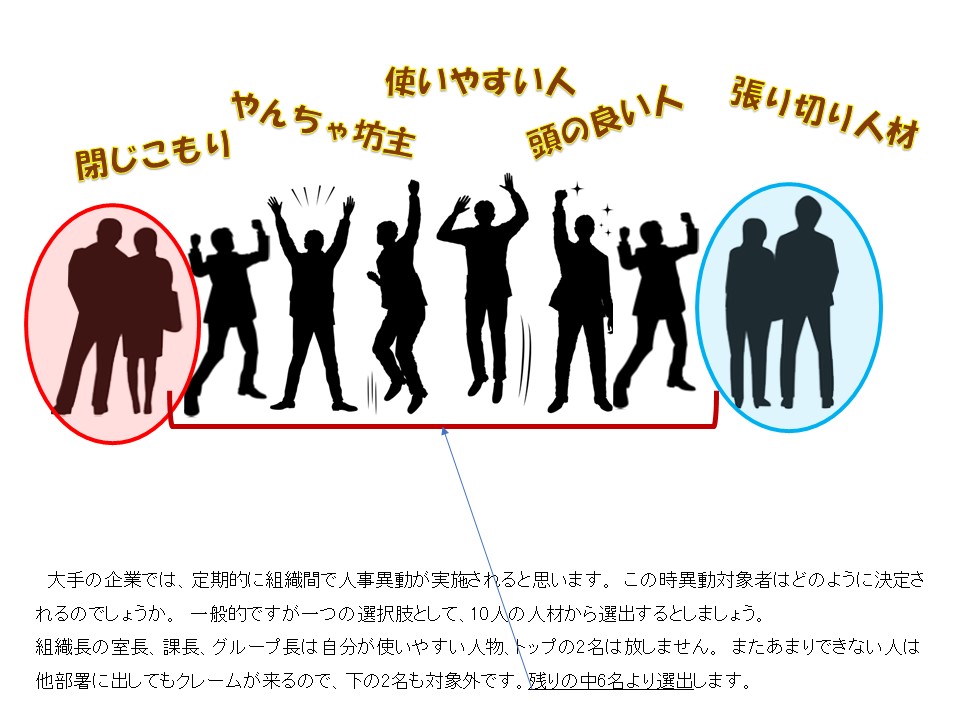 一般的ですが一つの選択肢として、10人の人材から選出するとしましょう。組織長の室長、課長、グループ長は自分が使いやすい人物、トップの2名は放しません。 また、あまりできない人は他部署に出してもクレームが来るので、下の2名も対象外です。残りの中6名より選出します。