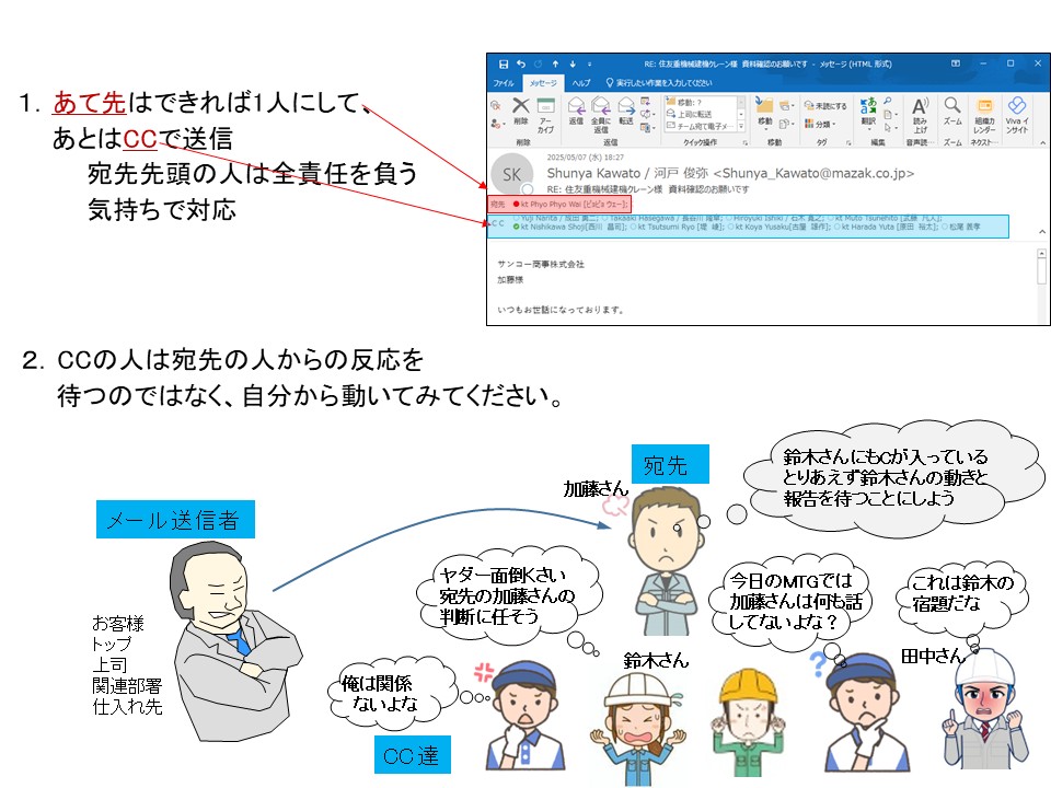 1.あて先はできれば1人にして、あとはCCで送信します。宛先先頭の人は全責任を負う気持ちで対応してください。
