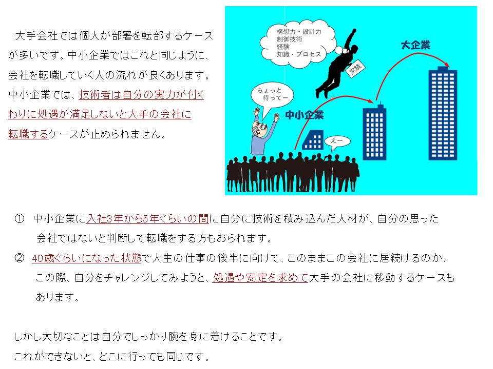 若い人は、自らの経験を広げたり、能力をあげて自分をいかに高めるかの方に気持ちがいきます。自分の能力を高めてより良い境遇の会社に転職する動きは、入社一年目から5年目ぐらいの若手の人に多く見受けられます。