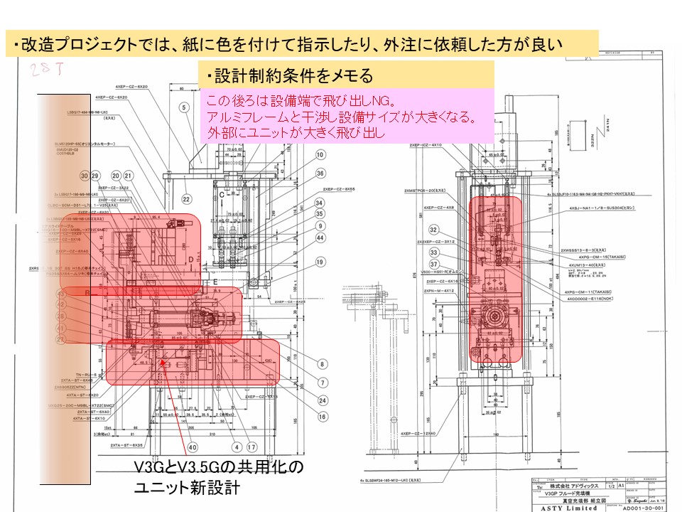 また、改造プロジェクトでは、現状の図面の紙に色を付けて指示したりして、部下や外注に依頼した方が良いです。CAD画面で一生懸命に説明するより、プリントアウトした紙に色で指示する方がアナログですが正確です。