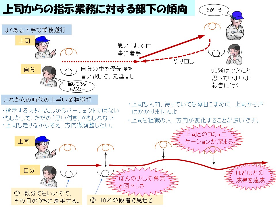 よくある上司の指示に対する部下の下手な業務遂行行動です。指示を受けても「なにかとっつきにくい」気があるため、今自分がやっている業務をまず先行させます。何日か経ってから仕方がないと取り組んだが、下手に上司に聞けないために、とりあえず自分の思っている通りに最後まで実施して、上司にできましたと言いに行きます。上司から違うと突き返されてまたやり直しです。