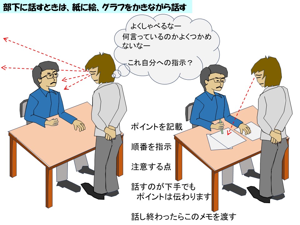 - 部下に話すときは、紙に絵、グラフをかきながら話す