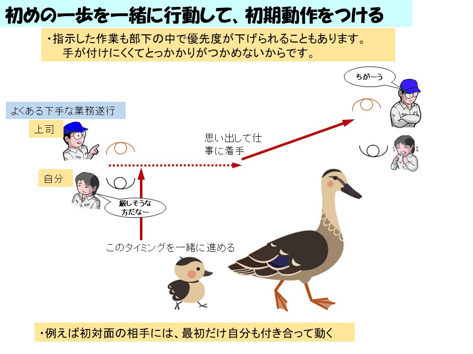 - 初めの一歩を一緒に行動して、初期動作をつける