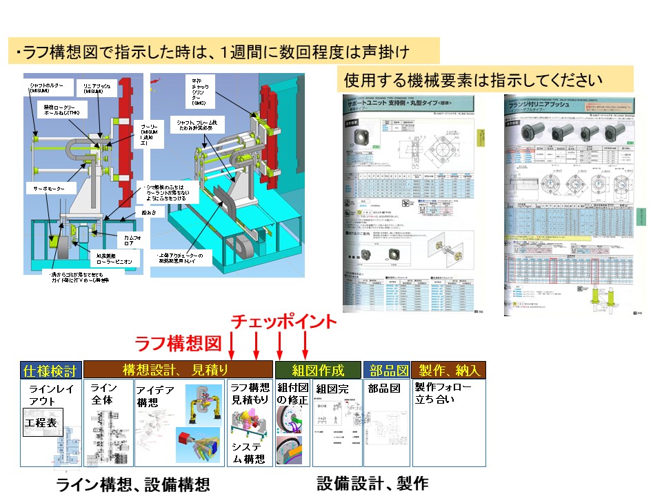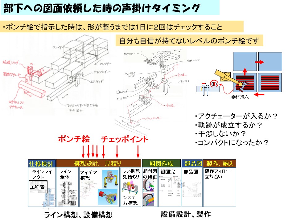 部下への図面依頼した時の声掛けタイミングについて説明します。ポンチ絵で構想図を指示した時は、形が整うまでは1日に2回はチェックすることです。1週間に数回程度は声掛けをします。ポンチ絵だと正確にスペース設計ができてないため、アクチェーターが入るか、動作の軌跡が成立するか、干渉しないか、コンパクトになったかなどは、実際に正確に絵を描く必要があります。その過程で何度も判断が必要です。使用する機械要素はできるだけ指示する側がガイドしてあげてください。