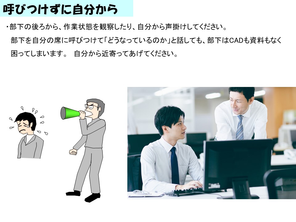 部下を自分の席に呼びつけて「どうなっているのか」と話しても、部下はCADも資料もなく困ってしまいます。 自分から近寄ってあげてください。