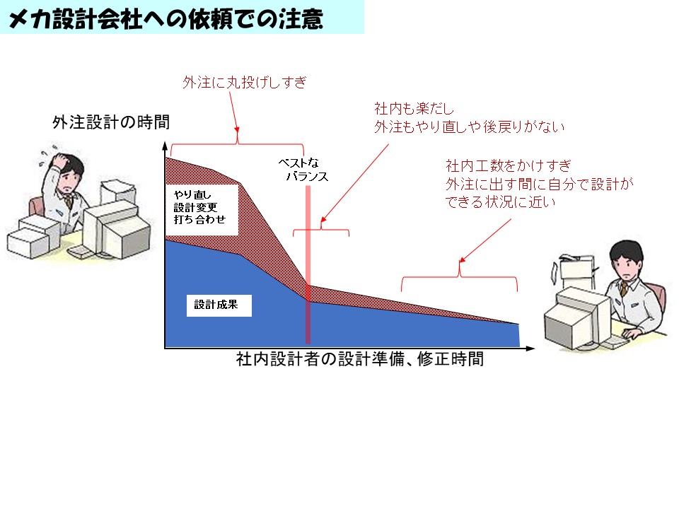 設計を依頼する人の工数と外注設計者の工数比較グラフについて説明します。依頼する側の人が、外注設計業者に分かりやすく説明するために資料を作りすぎたりすると、得てして 自分がそのまま設計した方が、外注に頼むより工数が早く済むというケースが多いです。 また、逆に依頼する人が何もしないと、外注設計の人は散々考えるばかりで手が進まなくなり、これもまた 効率が悪いです。この一番バランスのいいとこ、つまり依頼者が外注設計者が誤解しなく 間違いなく進められる最低限の情報だけで、外注さんにスタート かけれるのが一番ベストです。