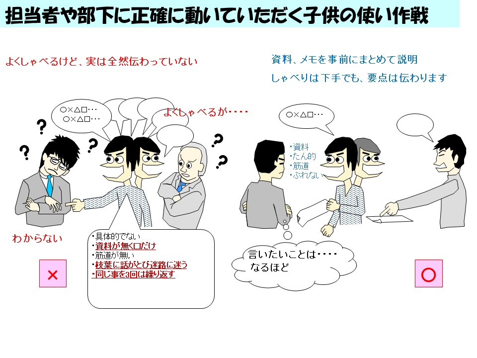 担当者や部下に、お客様や関係部署に出向いて行って行って仕事をしてもらってくるケースです。下手なリーダーは、交渉してくるべき部下に、ただ指示を出したつもりでいます。しかし、話が長すぎると焦点がボケてしまったり抽象的表現は理解されなくて終わることが多いです。モノづくりは、正確に形を示す必要がある為に、文章でなく、言葉でもなく、絵で示す方が正確であります。例えば、小学生に絵で具体的なことをはっきり明示して、その小学生の判断力や忖度には期待をせずに、ただこれを相手に渡して、こうこう言ってほしいというような言い方が、場合によっては正しく相手に伝わるのではないでしょうか。